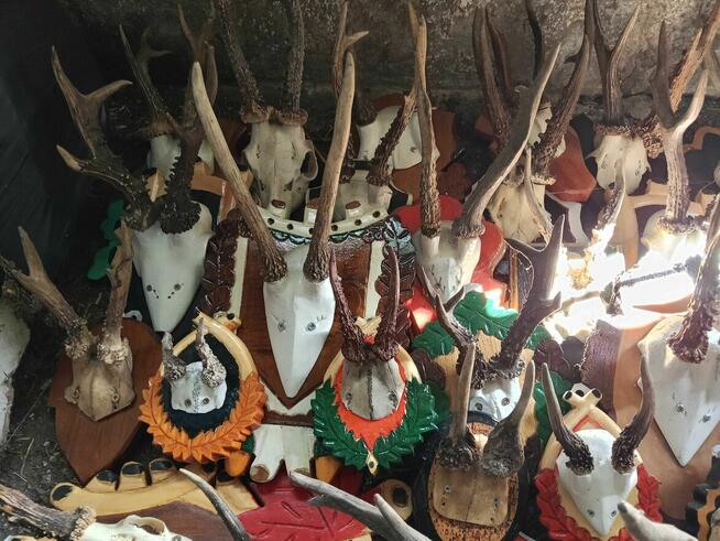 Na sprzedaż kolekcja trofeów myśliwskich – poroża parostki i inne zamocowane na ozdobnych, ręcznie wykonanych ...